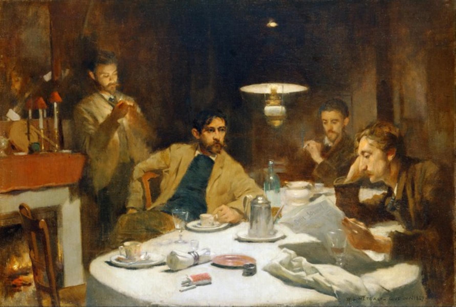 Artist: Willard Metcalf - Title: The Ten Cent Breakfast - Medium: Fine Art Giclee on Canvas - Image Size: Approximately 13.5 inches x 20 inches - Framed: Unframed on Unstretched Canvas - Biography: Willard Leroy Metcalf was an American artist born in Lowell, Massachusetts. He studied at the School of the Museum of Fine Arts, Boston, and later attended Académie Julian, Paris. After early figure-painting and illustration, he became prominent as a landscape painter.