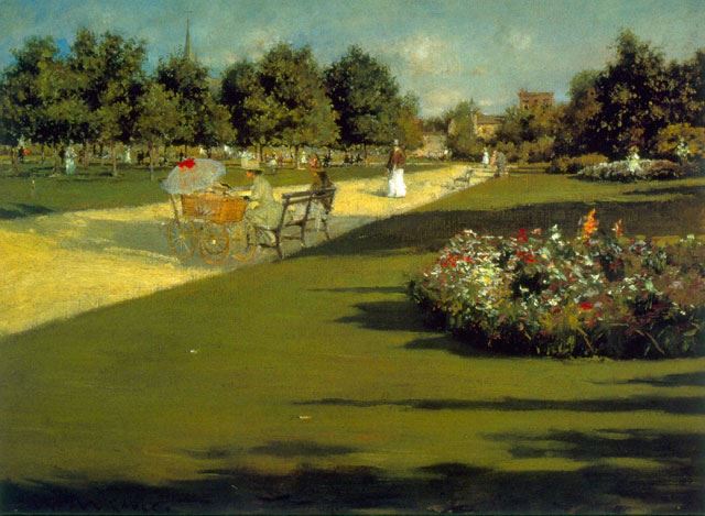 Artist: William Merritt Chase - Title: Prospect Park - Medium: Fine Art Reproduction Giclee on Canvas - Image Size: Approximately 14.5 inches x 20 inches - Unframed on Unstretched Canvas - Biography: Chase had a profound impact on shaping the development of modern art in the United States. As curator Erica Hirshler explains, "Chase developed an American version of Impressionism to depict modern subjects" and started incorporating other modern artmaking techniques in the way he "often employed daringly abstract compositions, devising interlocking patterns of vertical and horizontal lines or dramatic diagonal sweeps that provided a firm geometric foundation for his loose strokes of color".
