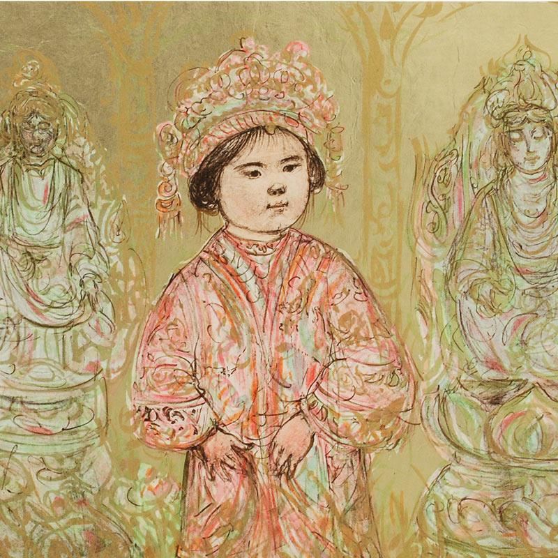 Wild lines and muted colors make Edna Hibel's art stand out in any room. "Willie and Two Quan Yins" is a limited edition lithograph on paper, numbered and hand signed by Hibel. Includes Certificate of Authenticity! Measures approx. 21.5" x 13" (with border), 16" x 10" (image).