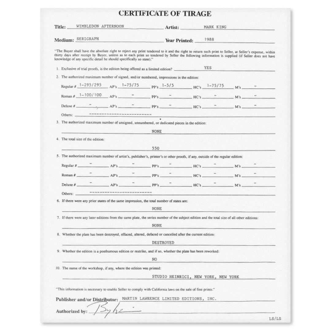"Wimbledon Afternoon" is a limited edition serigraph on paper by Mark King (1931-2014). Hand signed and numbered this piece comes with a letter of authenticity and measures approximately 30" x 40" (image).