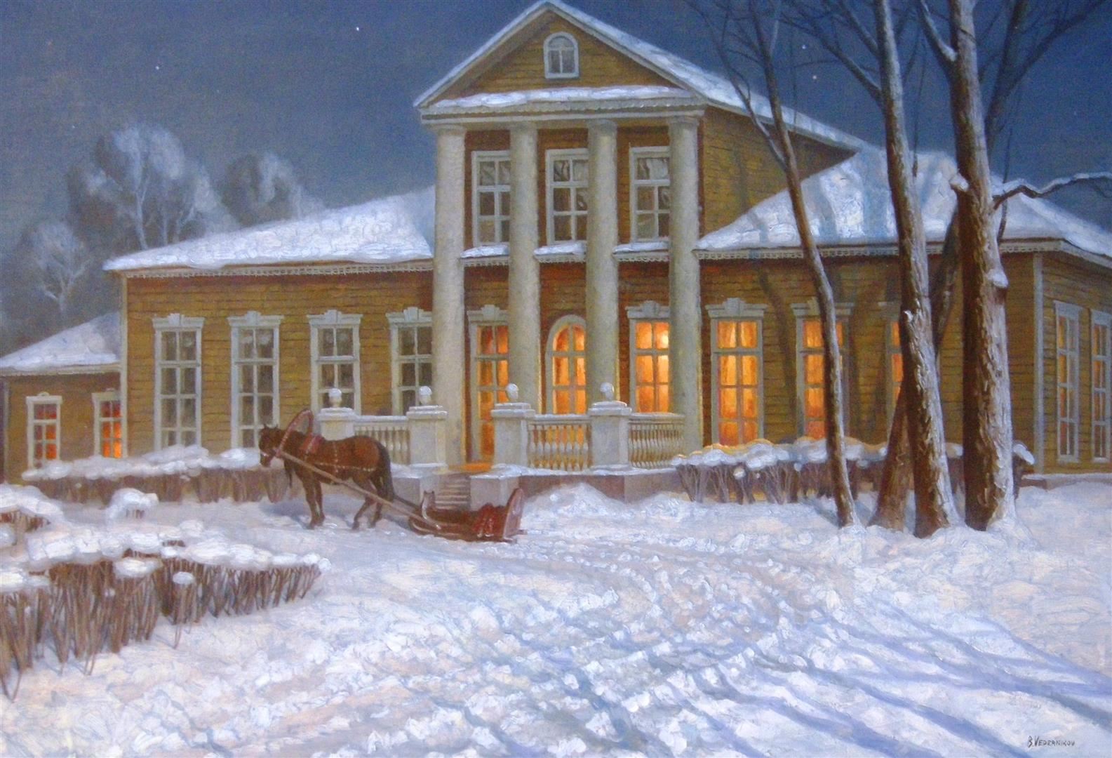 A horse, standing in the snow in front of a residence, awaits the occupant of its sled in Boris Vedernikov's oil on canvas. The painting measures 29.5 x 39.25; framed image measures approx. 41.5 x 51.25.