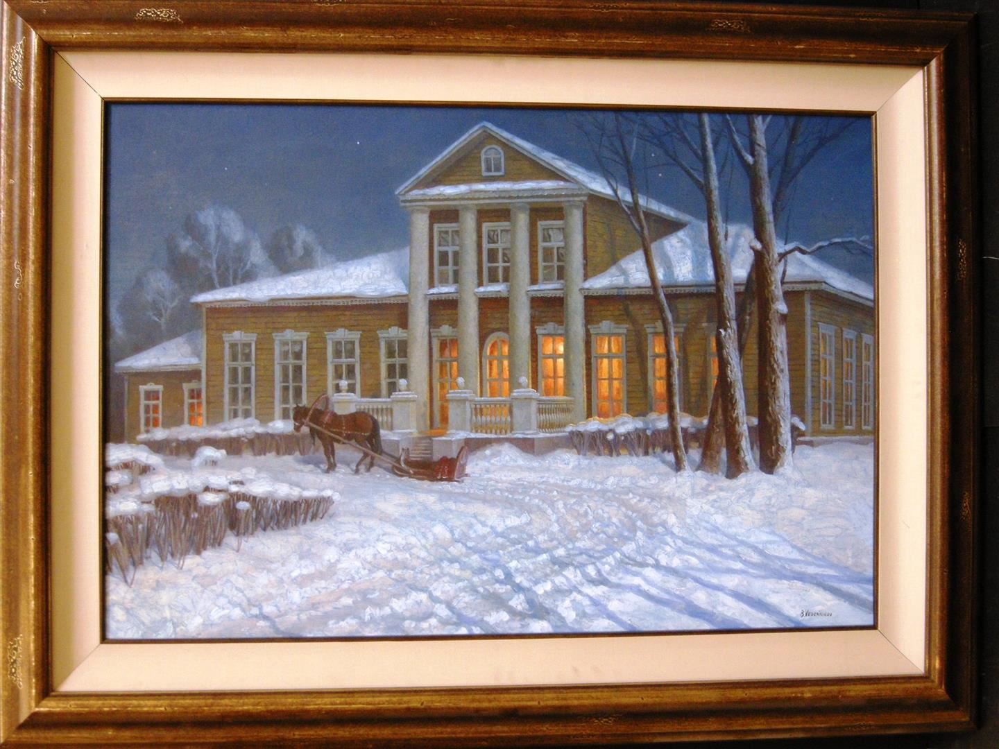 A horse, standing in the snow in front of a residence, awaits the occupant of its sled in Boris Vedernikov's oil on canvas. The painting measures 29.5 x 39.25; framed image measures approx. 41.5 x 51.25.