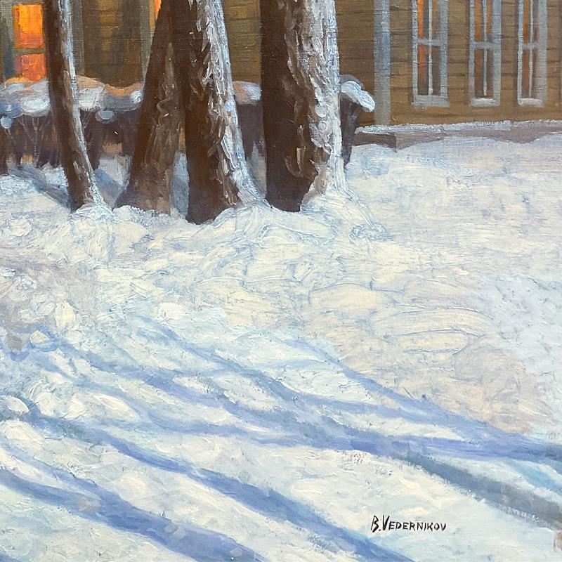 "Winter Night II" is an original oil painting on stretched canvas by Boris Vedernikov, hand signed by the artist. Includes Letter of Authenticity. Measures approx. 26" x 38" (image). There are some minor scuffs on the canvas.