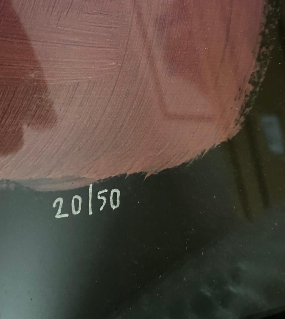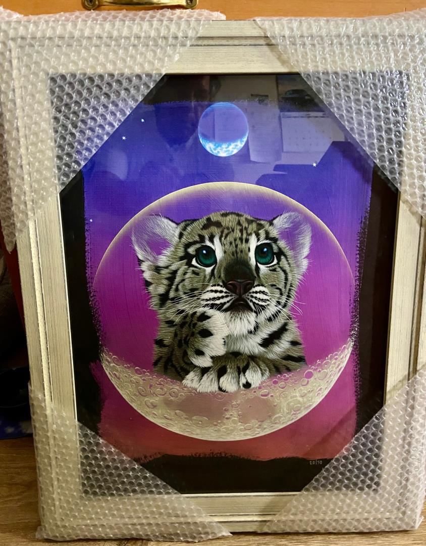 A framed limited edition serigraph by Schim Schimmel on black paper. Piece # 20/50 depicting one of his adorable tiger cubs. It is framed 25.5x20" in a shabby chic white molding.