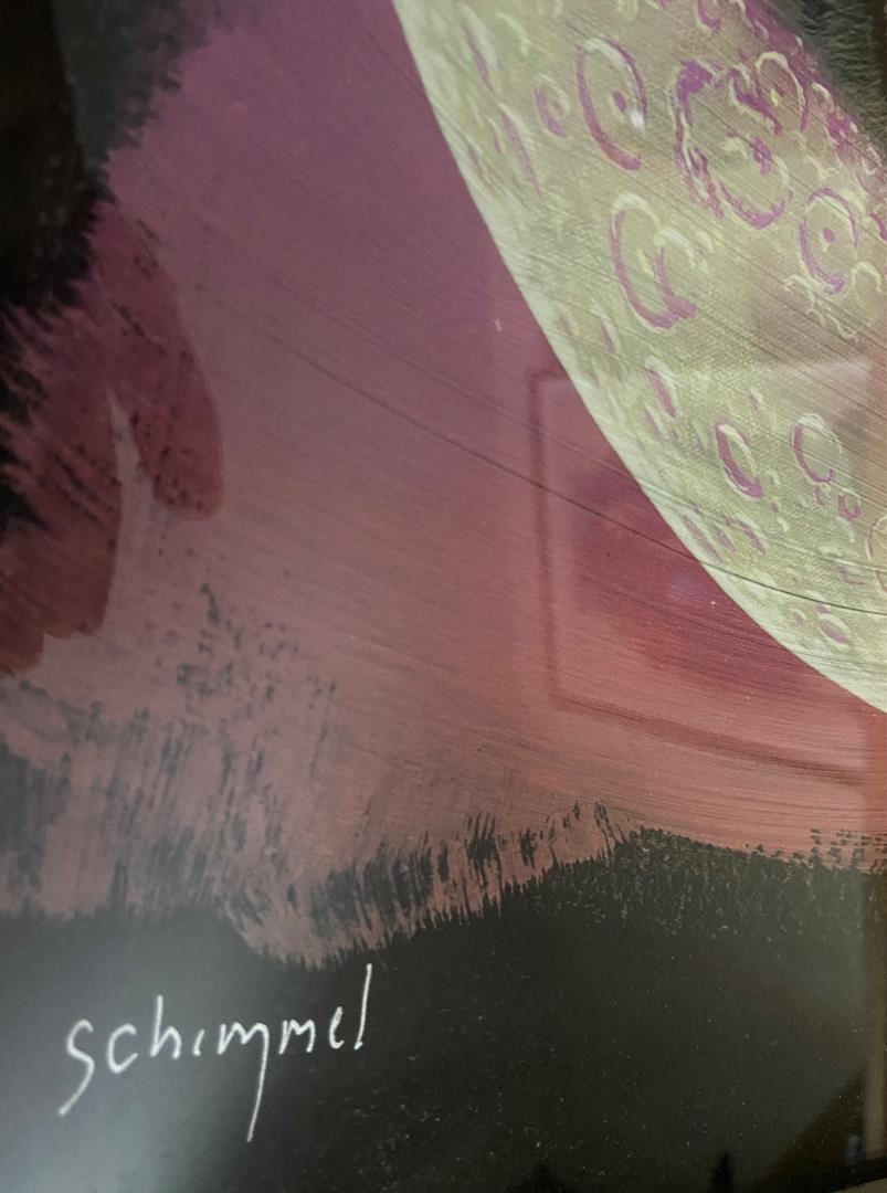 A framed limited edition serigraph by Schim Schimmel on black paper. Piece # 20/50 depicting one of his adorable tiger cubs. It is framed 25.5x20" in a shabby chic white molding.