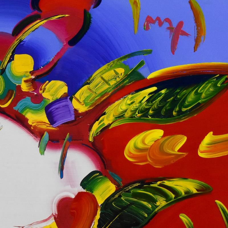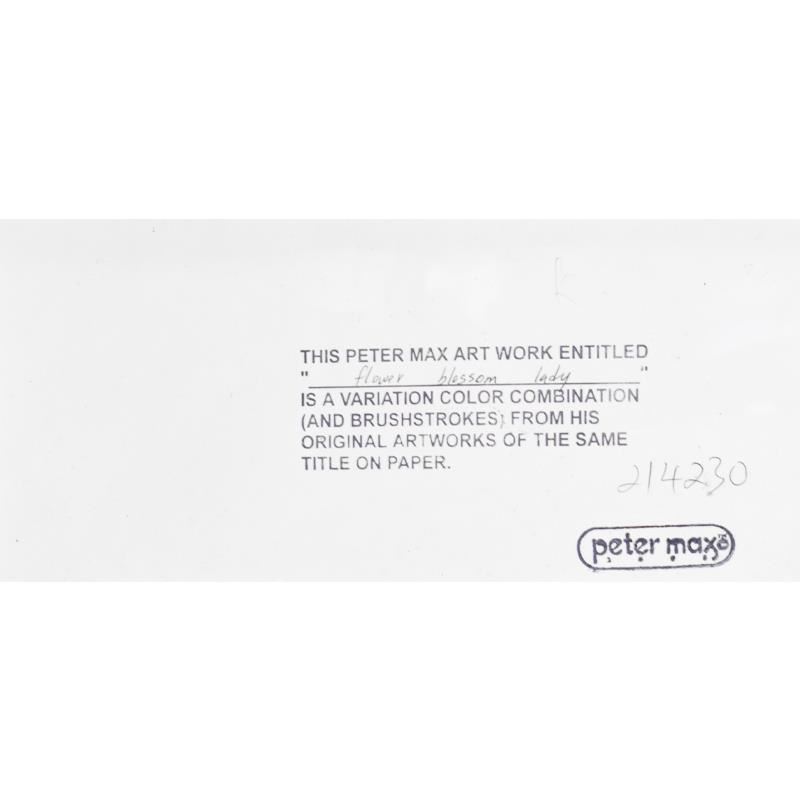 Woman in Love: Flower Blossom Lady By Peter Max. "Woman in Love: Flower Blossom Lady" is a one-of-a-kind acrylic mixed media on paper, hand signed by Peter Max. This piece comes custom framed. On the reverse side of this piece there is a registration number (214230) from Peter Max Studios certifying authenticity. Measures approx. 46.5" x 34.5" (with frame), 35" x 23" (image).