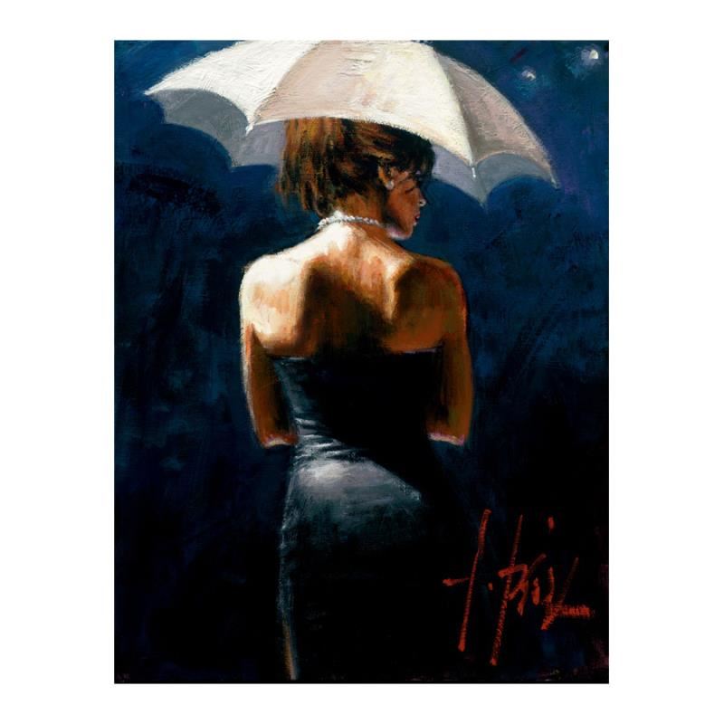 "Woman with White Umbrella III" is a hand embellished limited edition giclee on stretched canvas by Fabian Perez. The piece is numbered and hand signed by the artist and comes with a Certificate of Authenticity. Measures approx. 23" x 18" (image). Please allow 5 additional business for items that include canvas stretch or framing.