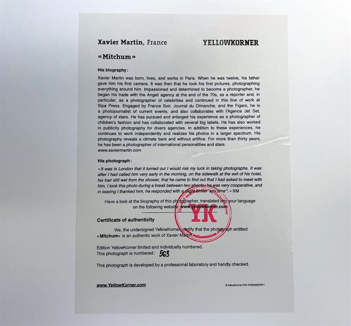 Xavier Martin Robert Mitchum YellowKorner Certified Photograph. Certificate of Authenticity from YellowKorner affixed to the back. Matted Dimensions 16"x20". Protected with Clear Mylar Sleeve.