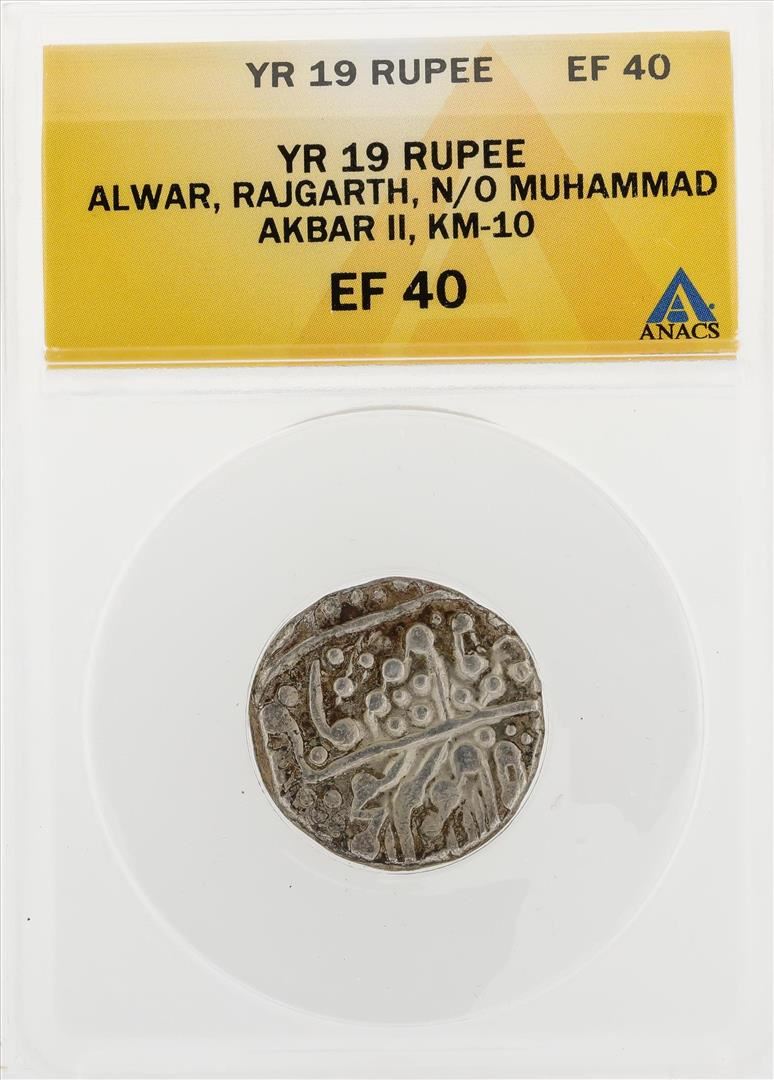 One YR 19 Rupee Alwar Rajgarth N/O Muhammad Akbar II KM10 Coin ANACS EF40. ANACS Appraised.