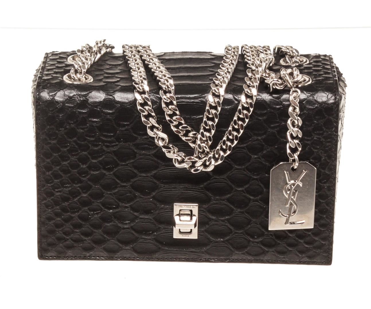 YSL Saint Laurent Black Python Embossed Minaudiere Camera Bag with brown leather trim, features a commanding YSL monogram logo at the front, bronze-tone hardware. Its zip closure opens to a brown fabric interior with slip pocket.