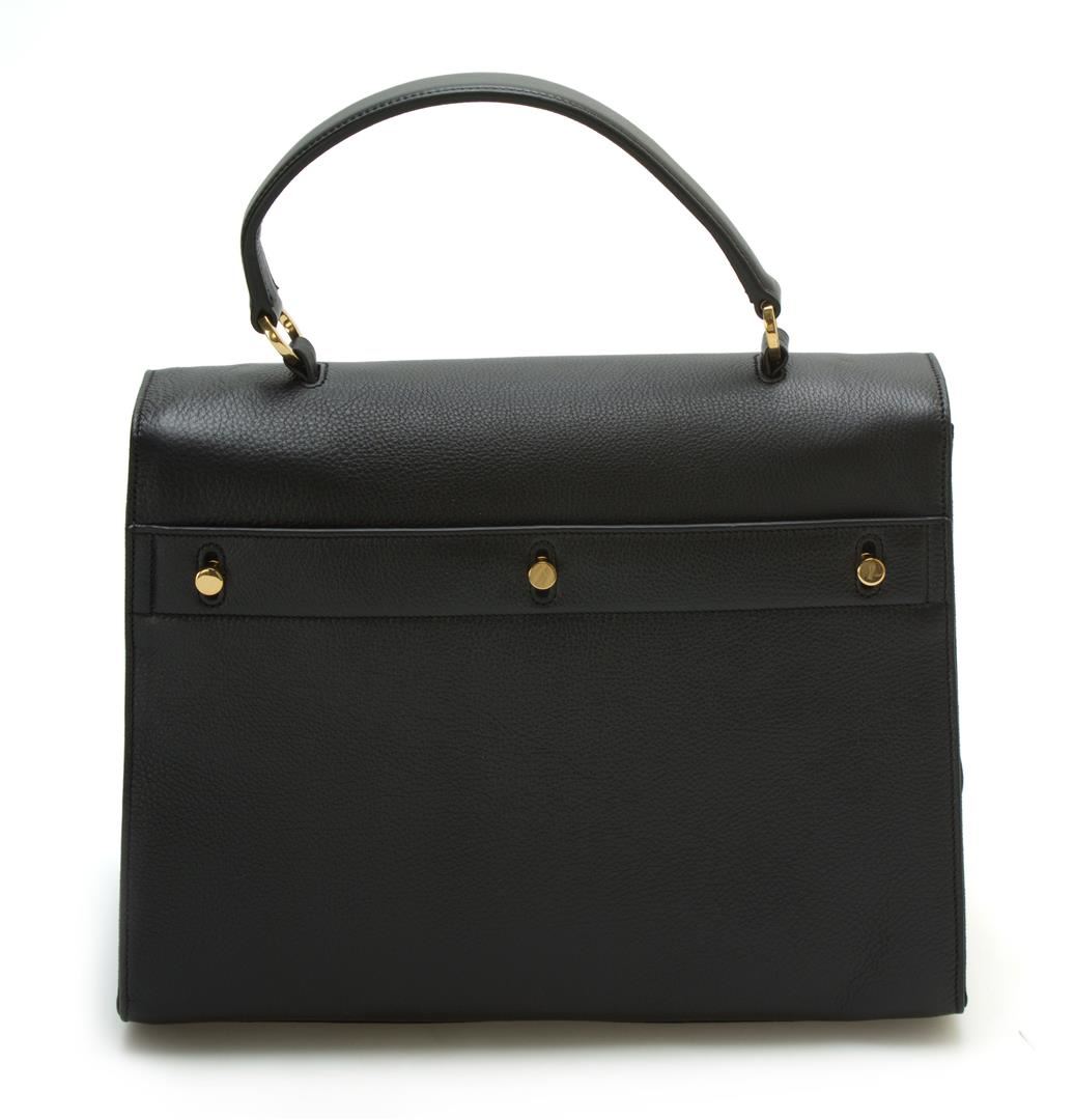 Saint Laurent YSL Muse 2 Black leather bag - all leather including sides Single top handle with 4.5" drop 3 Studs closures / push studs to expand sides 2 compartment and interior zip pocket, exterior flap pocket Bottom metal studs for protection Gold tone hardware Fully lining in fine red suede Dimension: size Medium / approx. 19.5"H X 2.5" W X 6"L It comes with detachable strap with drop 21.5", This is a brand new bag.