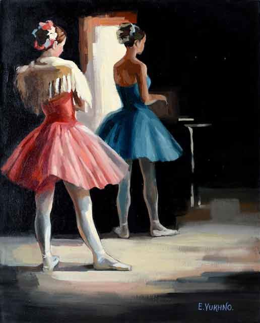YUKHNO **DRESS REHEARSAL** ORIGINAL. Artist: Elena Yukhno - Title: Dress Rehearsal - Medium: Original Acrylic on Canvas - Signature: This one-of-a-kind work is hand-signed by the artist at the bottom of the image - Image Size: Approximately 19 ¾ inches x 15 ¾ inches - Framed: Unframed on Unstretched Canvas - Details: This work comes with a Certificate of Authenticity - Biography: Elena Yukhno was born in 1952 in Kiev, Ukraine. She grew up in a family of two professional artists; her father is a famous Ukrainian painter, Ivan Yukhno, and her mother was a local painter, Anna Gurevich, shared an art studio in Kiev. They gave Elena her first painting and drawing lessons, often took her with them to their art studio in Kiev. - In 1992, Elena immigrated to Israel where she continued her artistic career. Elena focuses mainly on oil painting and she has numerous exhibitions in Israel and abroad. - Warranty: Item GUARANTEED to be as described