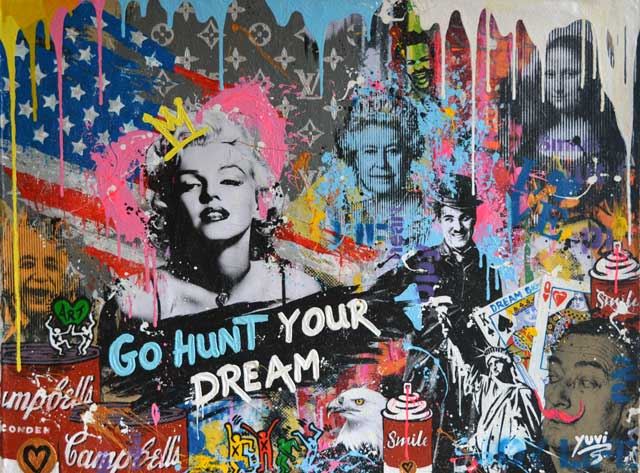 YUVI GO HUNT YOUR DREAMS ORIGINAL SIGNED. Artist: Yuvi - Title: Go Hunt Your Dreams - Medium: Original Acrylic on Canvas - Signature: Hand-signed by the artist - Image Size: Approximately 30 inches x 40 inches - Framed: Unframed on Unstretched Canvas - Biography: Yuvi describes himself as a graffiti inspired pop artist saying: "The street as the graffiti artist's main source of inspiration makes the work accessible, authentic, and relatable." The animation and vibrancy in each work takes us straight back to the streets which inspired them, and has won him exhibitions and admirers in places as diverse as New York and New Delhi. - Yuvi combines traditional techniques with digital technology. His characters and their settings are formed from paint, printed paper cuttings, layers of old newspaper clippings, sketches, silk screen prints, various glues, inks, spray paints, sand, glass fragments and more. He often uses his bare hands which means he has an intense physical relationship with every piece he creates; to look at his hands after a day in his studio is to understand his dedication, passion, and love for his work. The finished composition is intensely tactile and the spectator is invited to feel the work with their hands. - Warranty: Item GUARANTEED to be as described