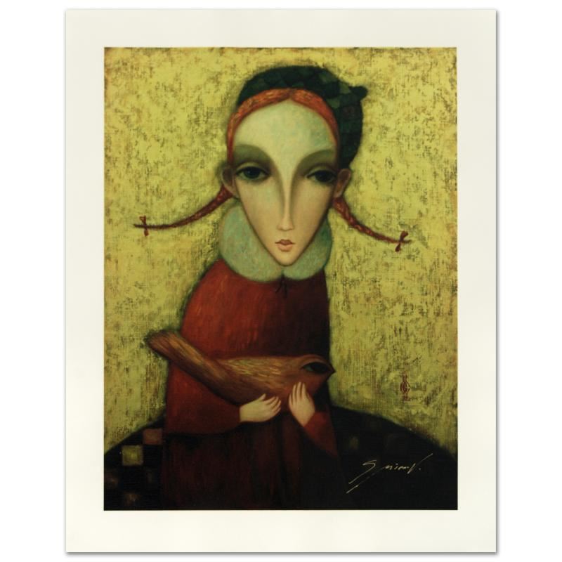 Combining time-honored religious icon painting with western style portraiture, the hauntingly beautiful art of Sergey Smirnov (1953-2006) is inspired by the 'Parsuna' art movement. "Yana" is a limited edition mixed media on canvas, printed in 2006, numbered in verso and hand signed by the artist. Includes Certificate of Authenticity! Measures approx. 13" x 17" (image).