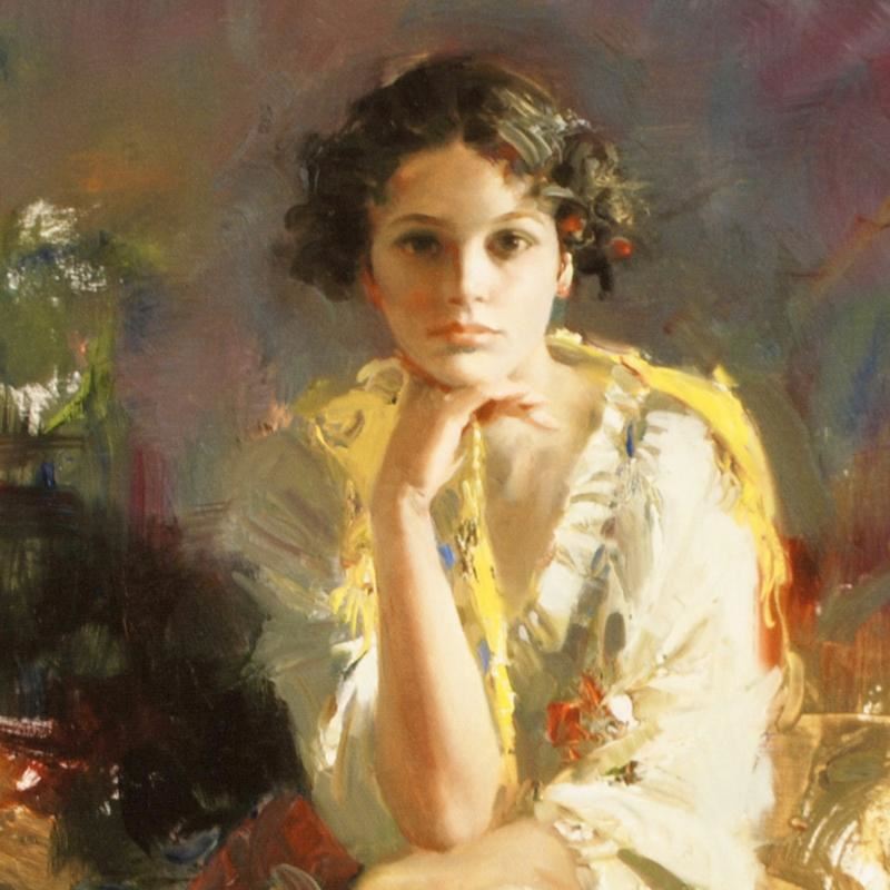 "Yellow Shawl" is a limited edition giclee on canvas, numbered and hand signed by Pino (1939-2010). Includes Certificate of Authenticity! Measures approx. 10" x 14" (image).