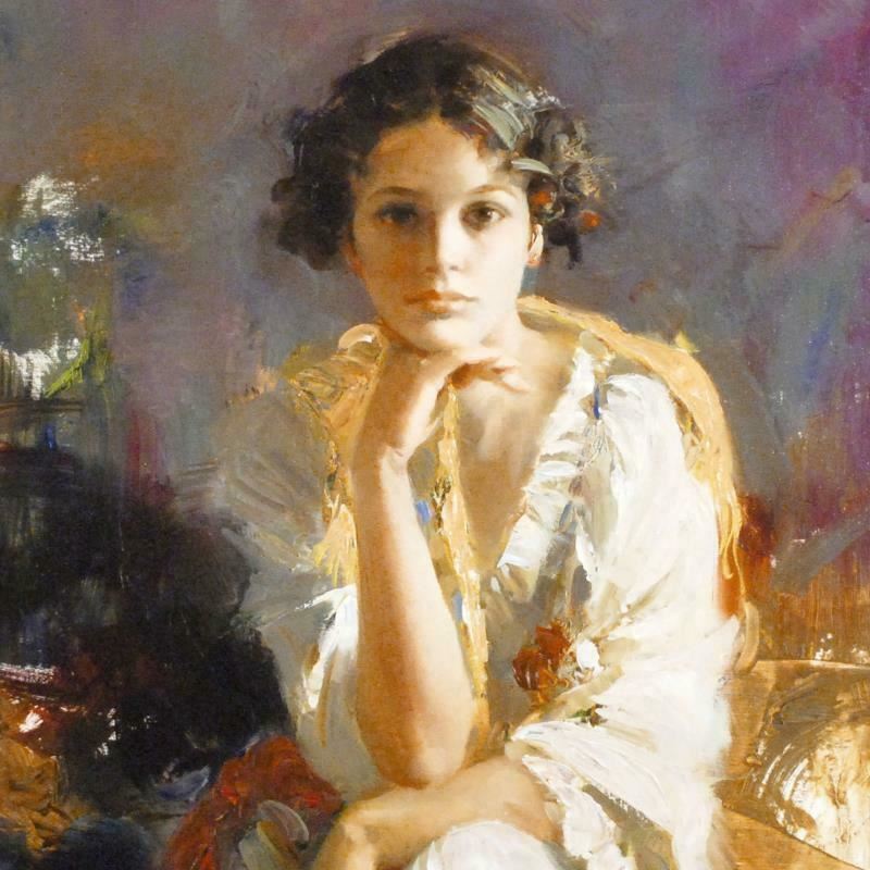 "Yellow Shawl" is a hand embellished limited edition giclee on canvas by Pino (1939-2010), numbered and hand signed. Includes Certificate of Authenticity. Measures approx. 22" x 30" (image). This piece is not stretched.