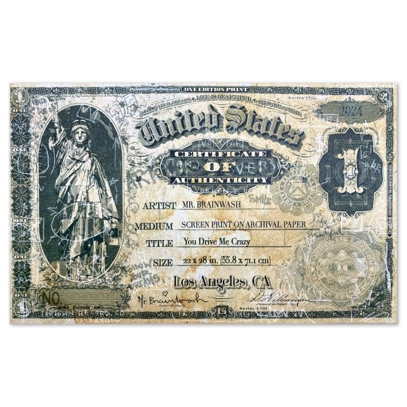 "You Drive Me Crazy" is a limited edition silk screen print on paper by Mr Brainwash hand signed and thumb-printed by the artist. The piece comes custom framed with a Certificate of Authenticity. Measures approx. 34" x 26" (framed) 30" x 22" (image).