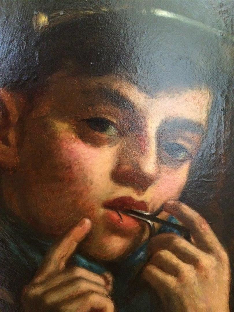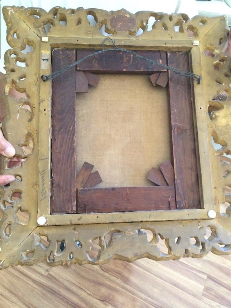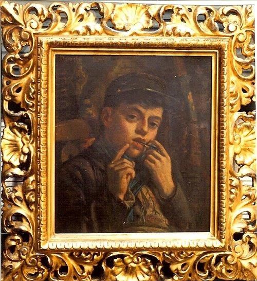 19th Century American painter John Donaghy ( 1838-1931) painted this original oil on canvas during a brief stop at the railroad station on his way home, near the end of the American Civil war. This young Union Army recruit was playing the mouth harp to entertain the wounded as they waited for transport. It is one of the few Civil war paintings created by Donaghy, that has survived to this day. The gilded frame that adorns it hails from a later period - probably 1920-1930's New York. It was purchased in 1965-67 from a New York auction house and has been in a private collection ever since. Condition, for its age, is excellent.