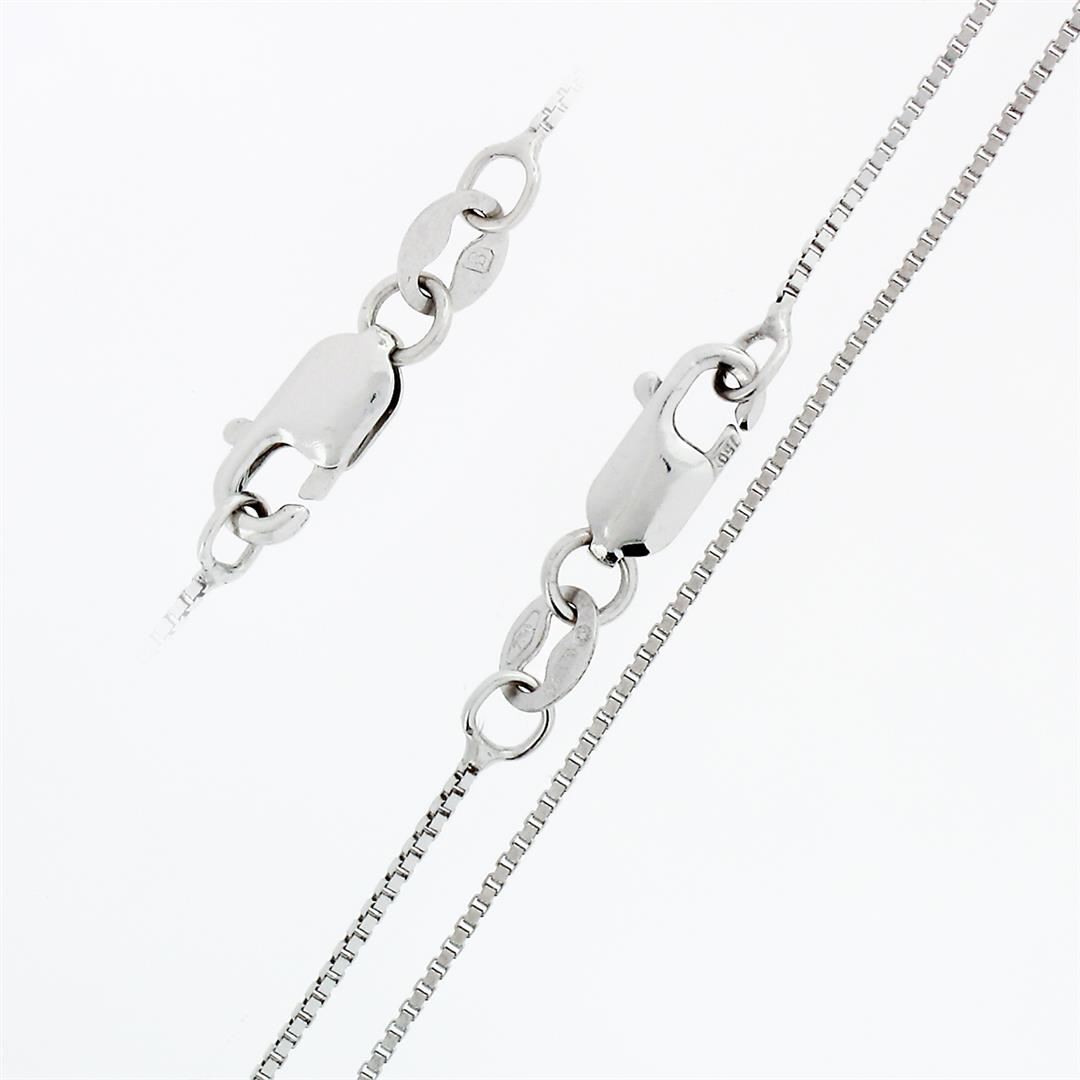 A solid 14k white gold wavy pendant necklace by Yukiko, with 12 round brilliant cut natural diamonds (G/H - VS2/SI1 ; 0.12ctw). 16.5 inch fine box link chain, 6.95 grams total weight, pendant measures 50.10x11.90mm.