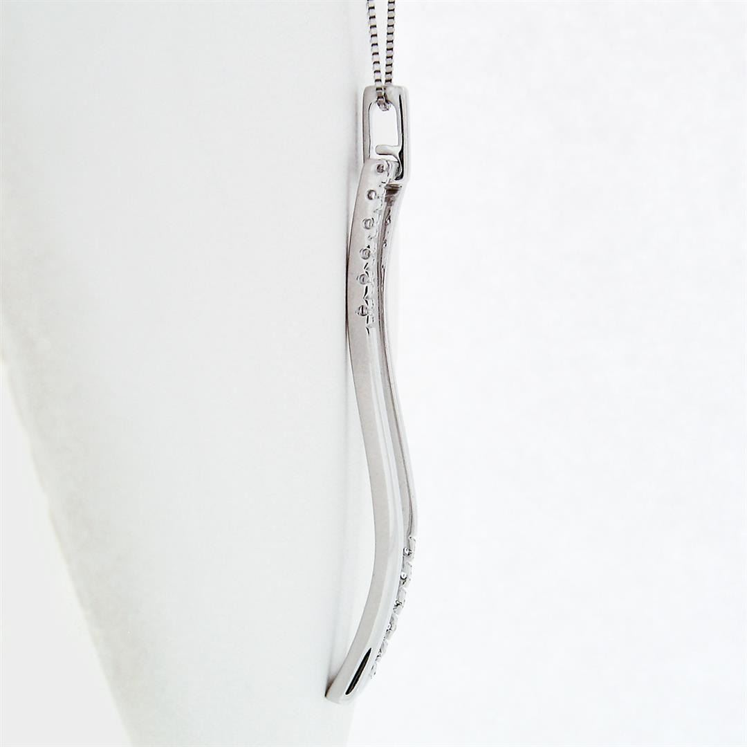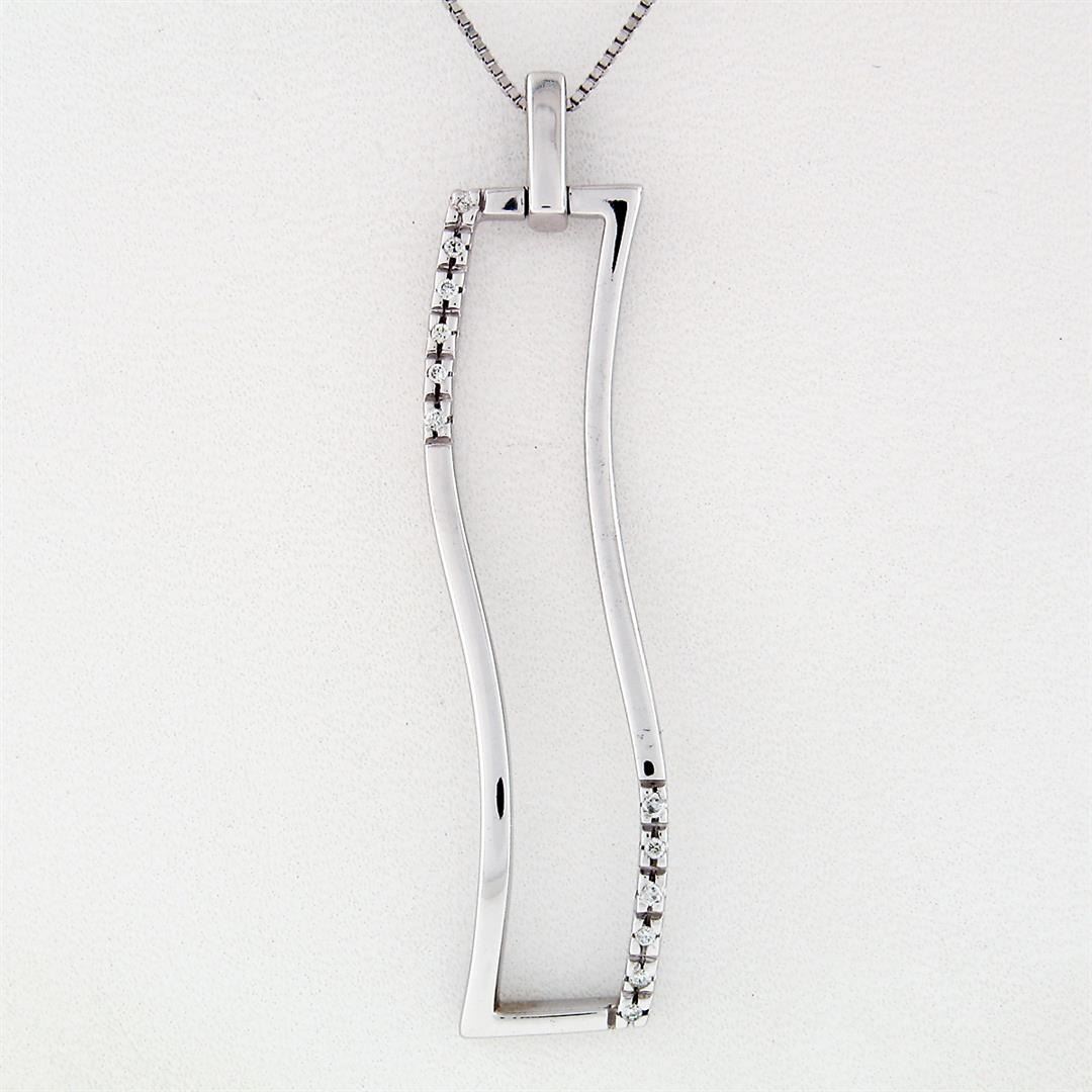 A solid 14k white gold wavy pendant necklace by Yukiko, with 12 round brilliant cut natural diamonds (G/H - VS2/SI1 ; 0.12ctw). 16.5 inch fine box link chain, 6.95 grams total weight, pendant measures 50.10x11.90mm.