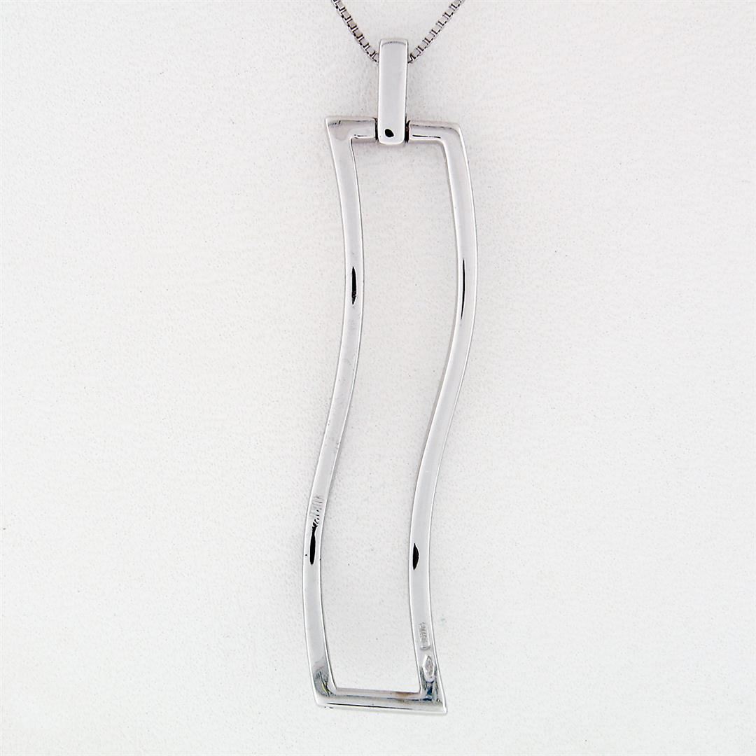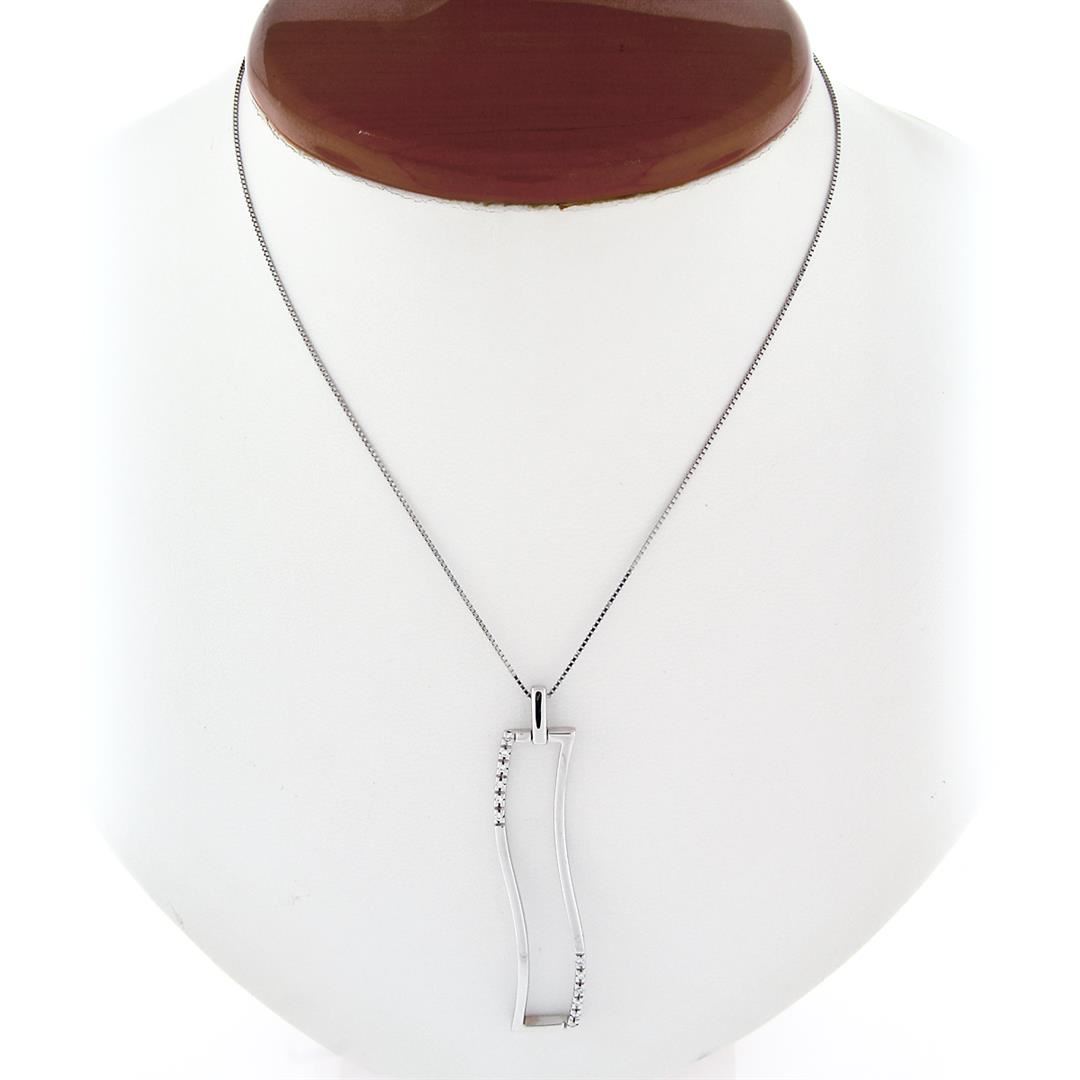 A solid 14k white gold wavy pendant necklace by Yukiko, with 12 round brilliant cut natural diamonds (G/H - VS2/SI1 ; 0.12ctw). 16.5 inch fine box link chain, 6.95 grams total weight, pendant measures 50.10x11.90mm.