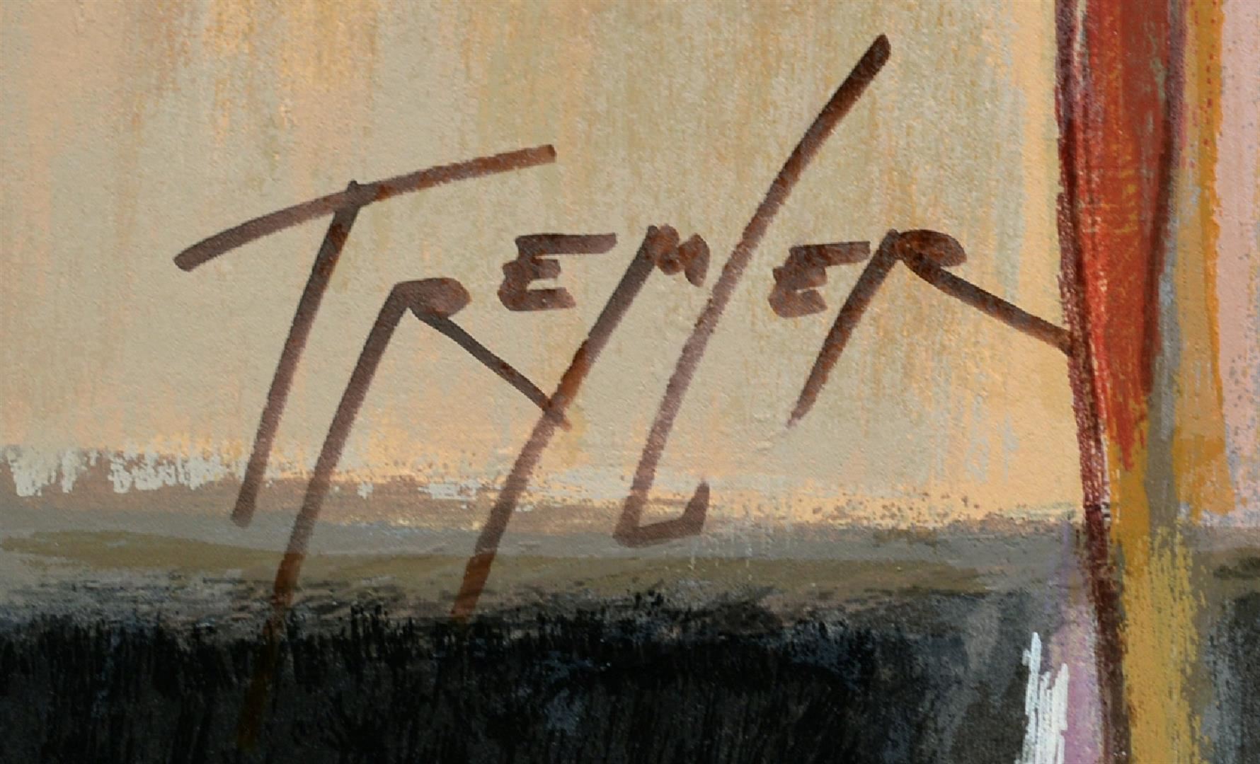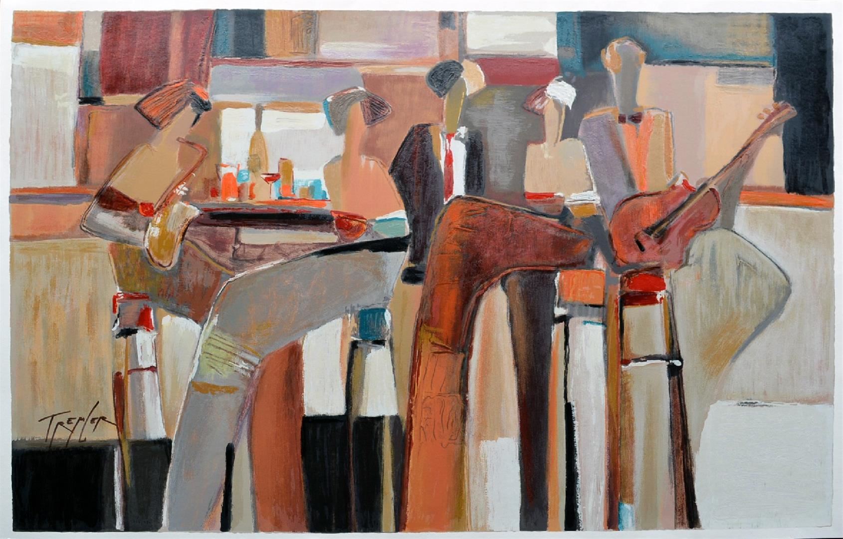 Artist: Yuri Tremler - Title: Music at the bar - Medium: Serigraph on Fine Art Paper - Signature: Hand-signed by the Artist - Limited Edition: 480 - Image Size: Approximately 28 inches x 39 inches - Paper Size: Approximately 29.5 inches x 40.5 inches - Unframed - Details: This work comes with a Certificate of Authenticity - Yuri's art reminds us of sudden still-life, left after an intimate party, of time spent with friends, or shared past which still excites. Sometimes whimsical, sometimes nostalgic, Tremler's art reaches inward to basic emotions of humanity.