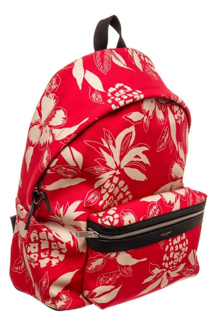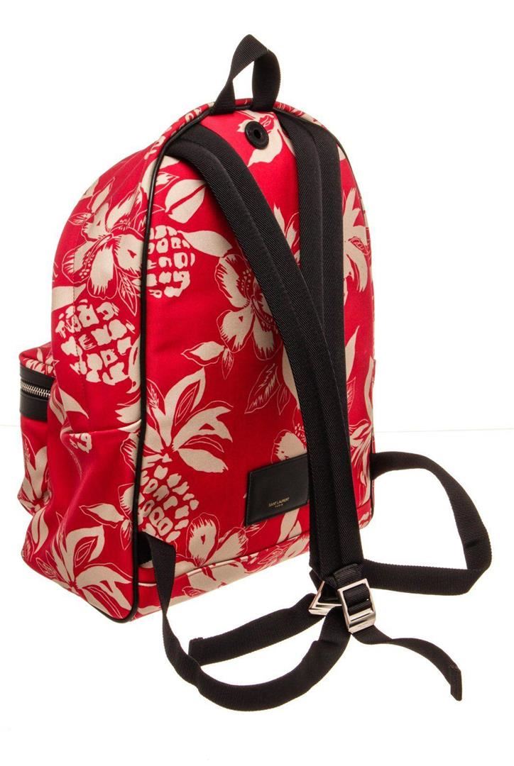 Yves Saint Laurent Red Canvas City Backpack with canvas lining, interior zip pocket along back wall, front zip pocket, adjustable shoulder straps, two way zip closure.