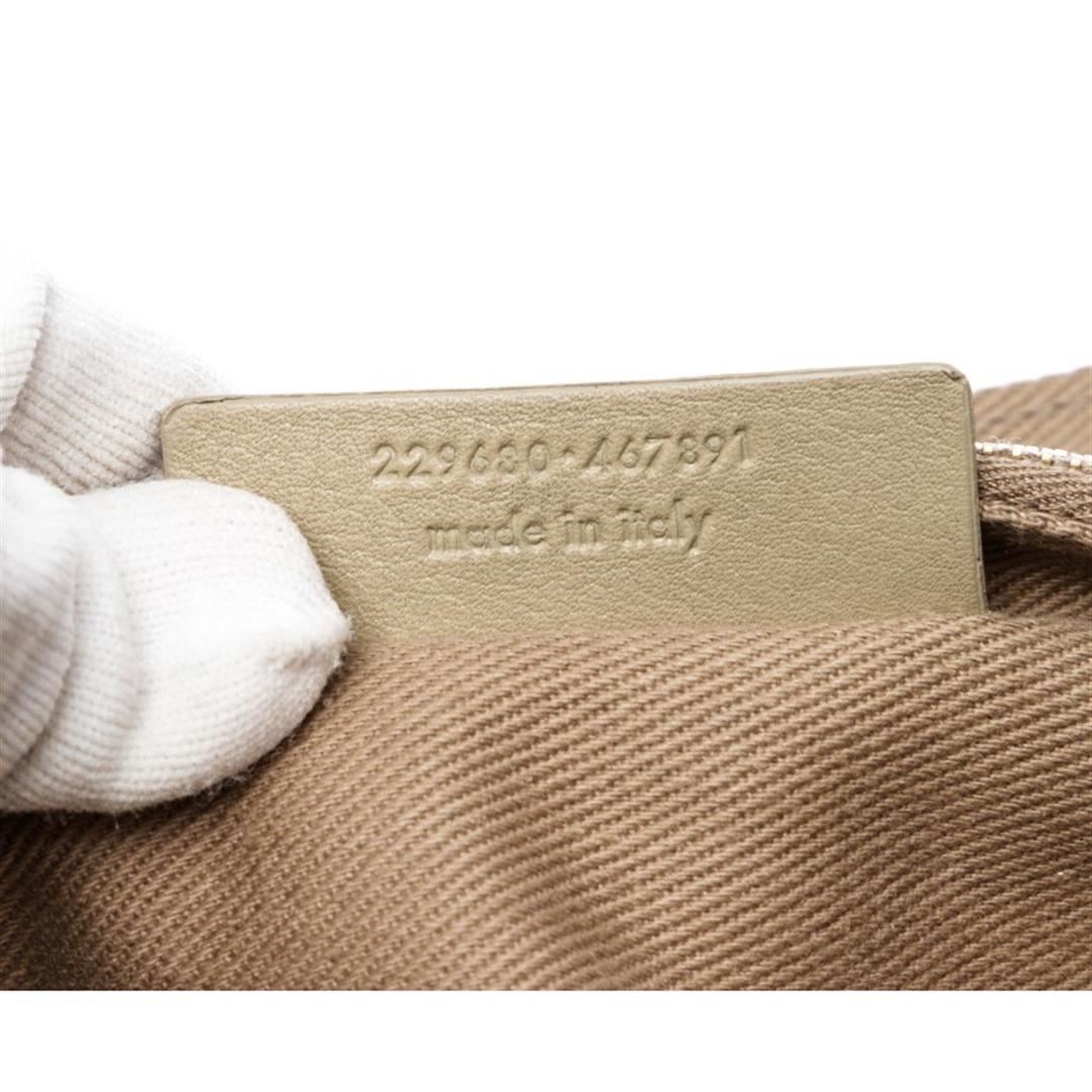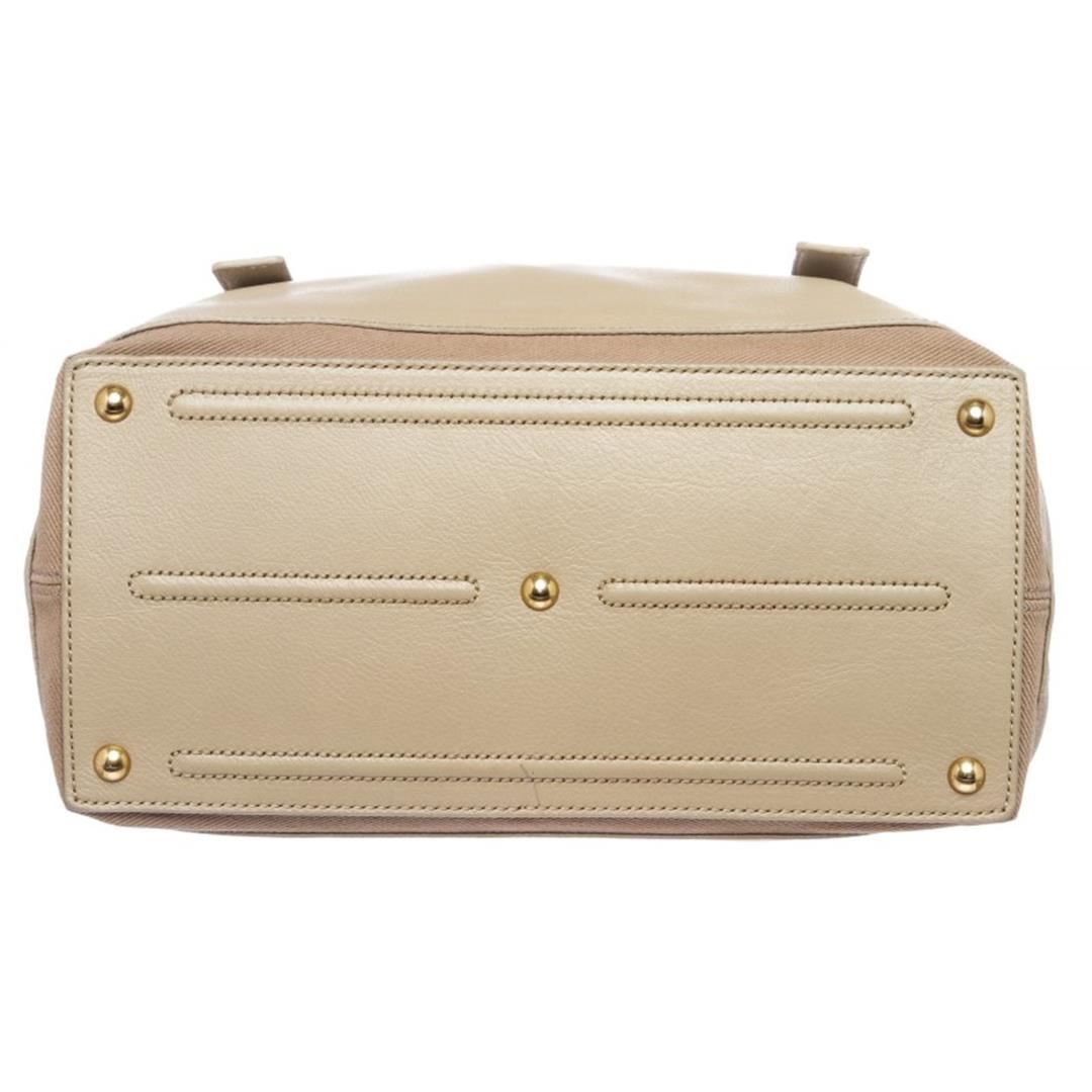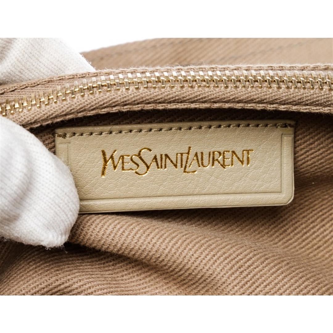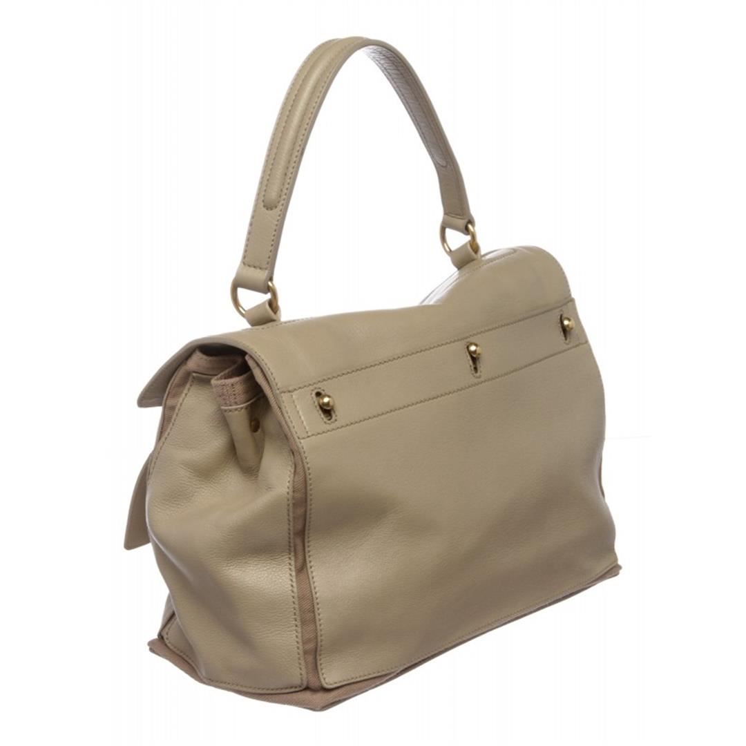 Taupe leather Yves Saint Laurent Muse Two bag with gold-tone hardware. single flat top handle, tonal canvas trim, single pocket at back exterior with peg-through-hole closures, tonal canvas lining, three interior compartments; one with zip closure and flap with peg-in-hole closure at front. Item is pre-owned.
