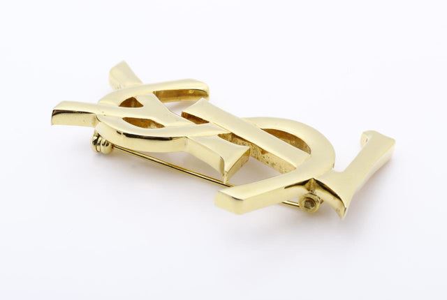 Yves Saint Laurent Vintage pin brooch features gold-tone hardware with YSL logo and a safety-pin closure clasp.