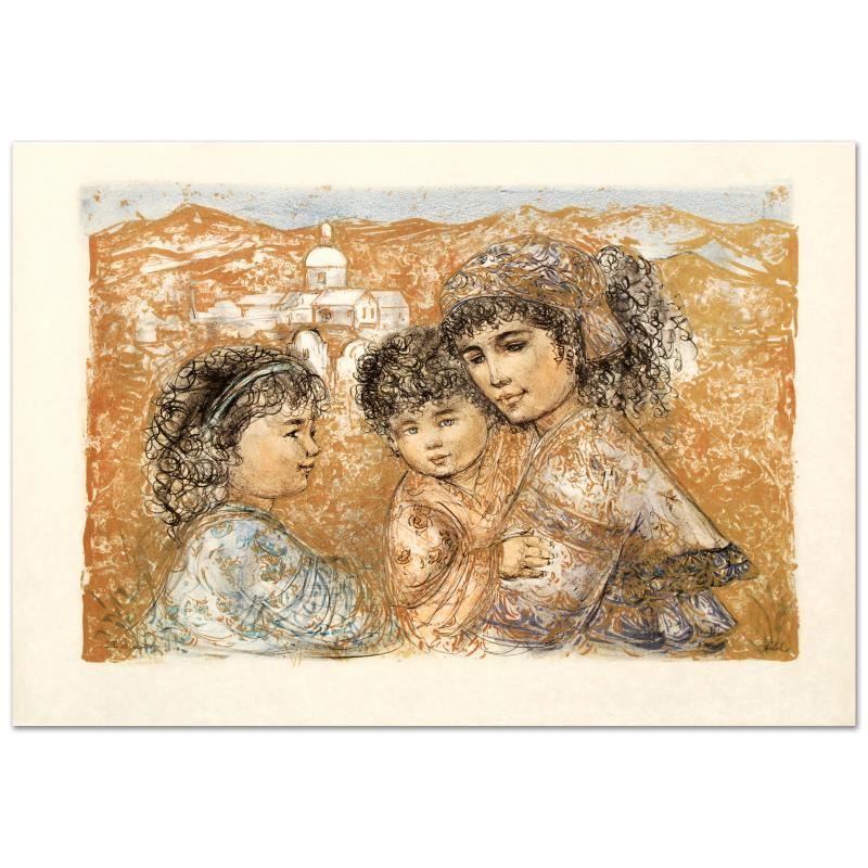 "Zalina with Aries and Ande" is a limited edition lithograph on rice paper, numbered and hand signed by Edna Hibel (1917-2014). Includes Certificate of Authenticity! Measures approx. 35.5" x 25" (with border), 30" x 20" (image).
