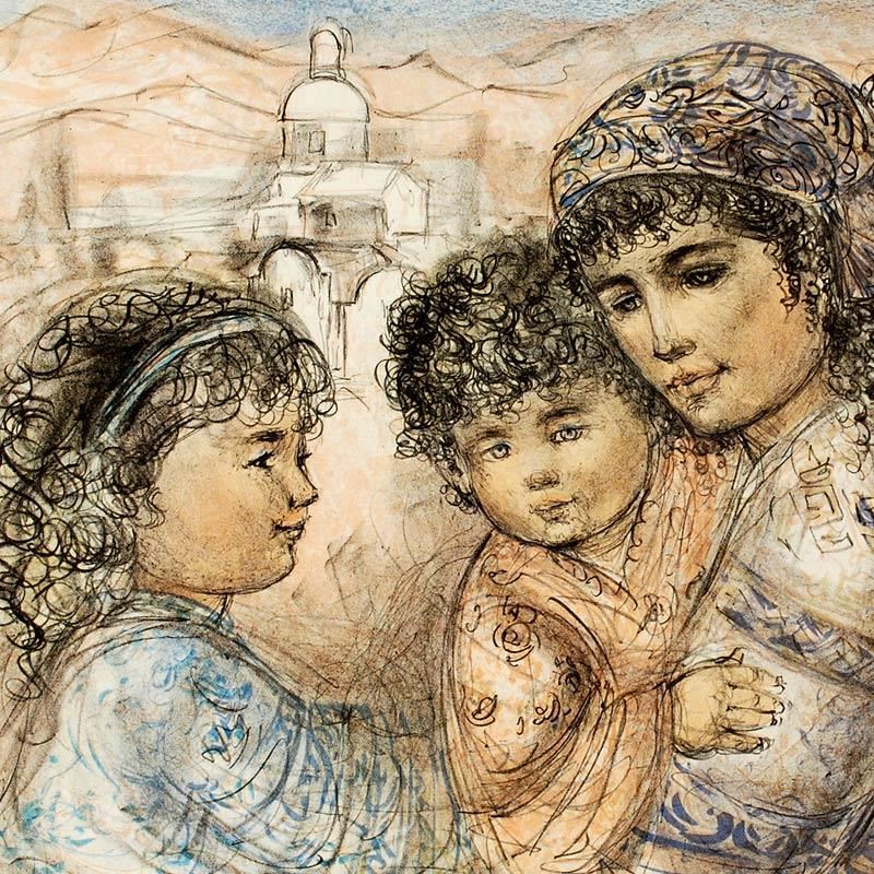 Wild lines and muted colors make Edna Hibels art stand out in any room. "Zalina with Aries and Ande" is a limited edition lithograph on paper numbered and hand signed by Hibel. Includes Certificate of Authenticity! Measures approx. 35.5" x 25" (with border) 30" x 20" (image).