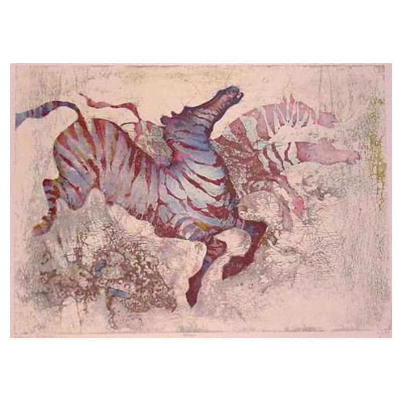 "Zebras", is a limited edition Serigraph on Paper by Edwin Salomon. Numbered and hand signed, this piece is accompanied by a letter of authenticity. Measures approximately 19" x 28" (image).