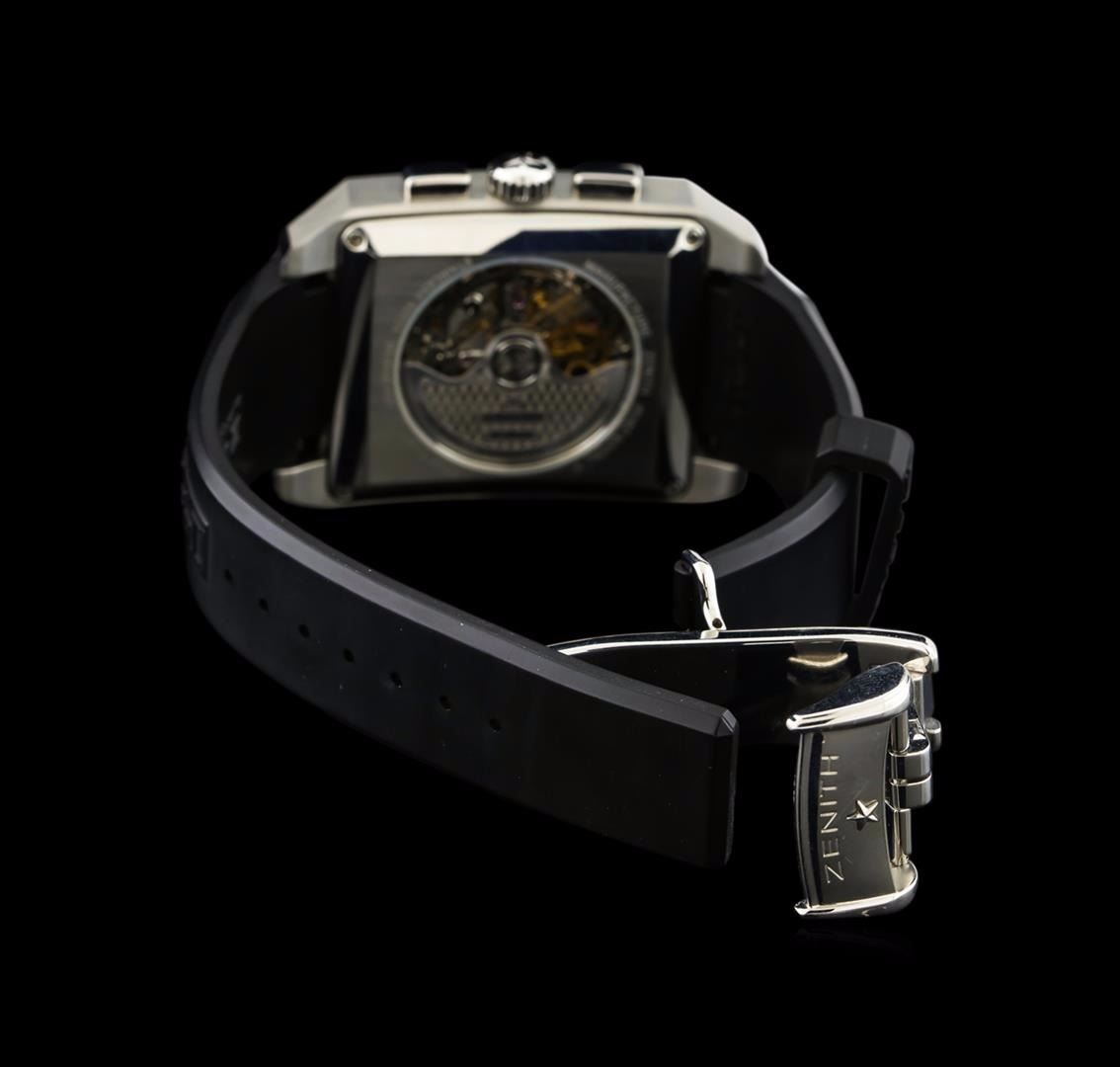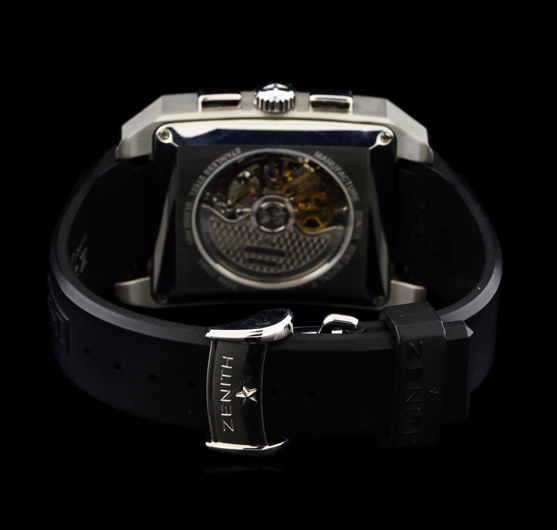 One, Zenith Port Royal Open Grande wristwatch electronically tested stainless steel, Case: 51 x 36mm, Water Resistant: 50 meters / 165 feet, Exhibition Case Back: synthetic sapphire port, the case back frame is secured by four set screws, engraved with the manufacturers information and ID numbers, Logo'd Crown, scalloped, Bezel: brushed finish, Crystal: domed synthetic sapphire lens. Case Ring: stopwatch scale. Movement: Swiss automatic El Primero, 52 hour Power Reserve with dial indicator, Zenith signed Dial: Light Ivory color, with pointed hands, visible open escapement with a skeletonized balance bridge, Sub Dial: 30 minute timer at the 3 o'clock position Zenith Bracelet: rubber strap, Condition: G-6 Extra Fine. Eight inch length. Zenith concealed deployment clasp. Total Weight of Watch 138.17gm. AIG Appraised at $8,000.00.