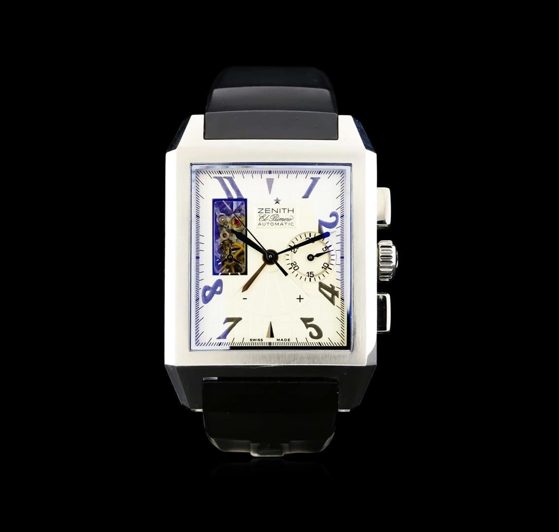 One, Zenith Port Royal Open Grande wristwatch electronically tested stainless steel, Case: 51 x 36mm, Water Resistant: 50 meters / 165 feet, Exhibition Case Back: synthetic sapphire port, the case back frame is secured by four set screws, engraved with the manufacturers information and ID numbers, Logo'd Crown, scalloped, Bezel: brushed finish, Crystal: domed synthetic sapphire lens. Case Ring: stopwatch scale. Movement: Swiss automatic El Primero, 52 hour Power Reserve with dial indicator, Zenith signed Dial: Light Ivory color, with pointed hands, visible open escapement with a skeletonized balance bridge, Sub Dial: 30 minute timer at the 3 o'clock position Zenith Bracelet: rubber strap, Condition: G-6 Extra Fine. Eight inch length. Zenith concealed deployment clasp. Total Weight of Watch 138.17gm. AIG Appraised at $8,000.00.