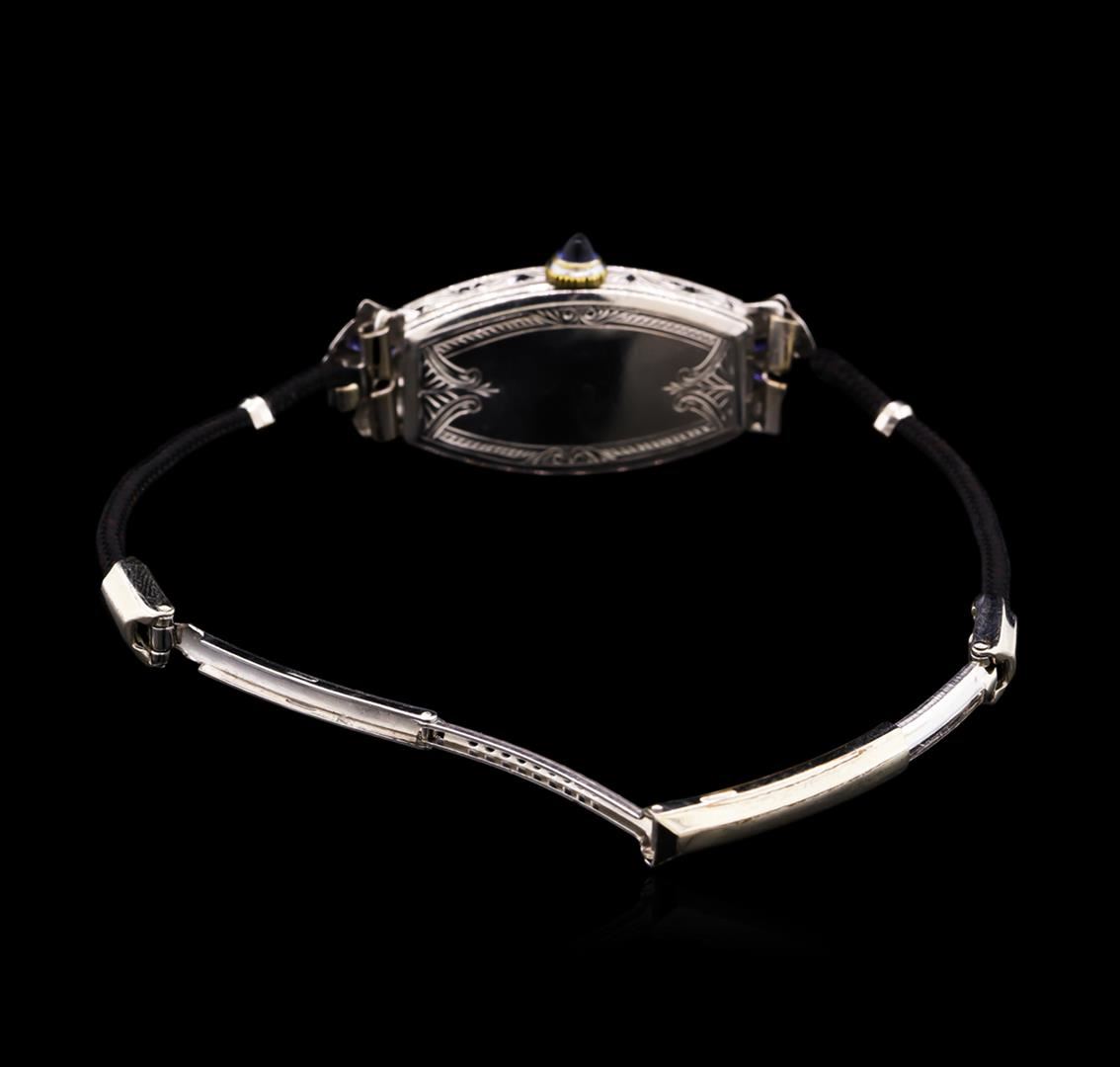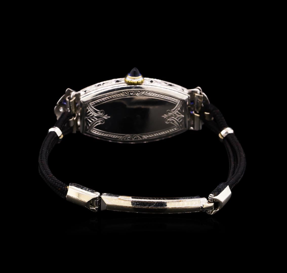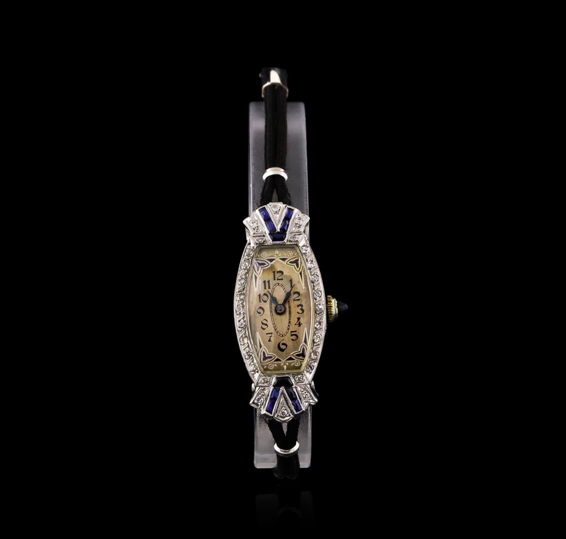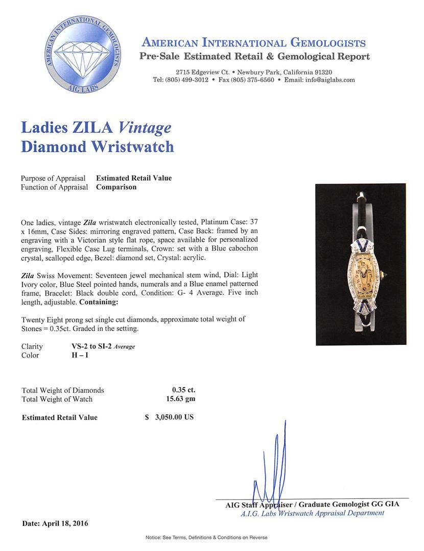 One ladies, vintage Zila wristwatch electronically tested, Platinum Case: 37 x 16mm, Case Sides: mirroring engraved pattern, Case Back: framed by an engraving with a Victorian style flat rope, space available for personalized engraving, Flexible Case Lug terminals, Crown: set with a Blue cabochon crystal, scalloped edge, Bezel: diamond set, Crystal: acrylic. Zila Swiss Movement: Seventeen jewel mechanical stem wind, Dial: Light Ivory color, Blue Steel pointed hands, numerals and a Blue enamel patterned frame, Bracelet: Black double cord, Condition: G- 4 Average. Five inch length, adjustable. Containing: Twenty Eight prong set single cut diamonds, approximate total weight of Stones = 0.35ct. Graded in the setting. Clarity: VS-2 to SI-2 Average. Color: H - I. Total Weight of Diamonds 0.35ct. Total Weight of Watch 15.63gm. AIG Appraised at $3,050.00.