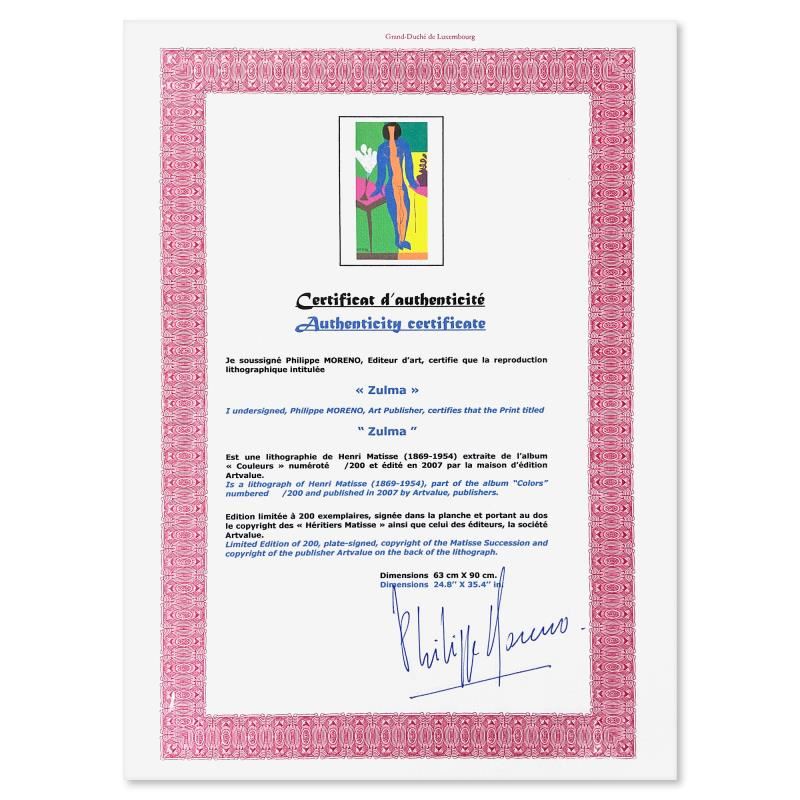 "Zulma" is a limited edition lithograph by Henri Matisse (1869-1954) bearing the plate signature of the artist. This piece comes from an edition of 200 authorized by the Matisse Estate; the edition number is not on the piece itself but on the certificate. This piece comes custom framed. Includes Certificate of Authenticity. Measures approx. 31" x 41.5" (frame), 25" x 35.5" (image).